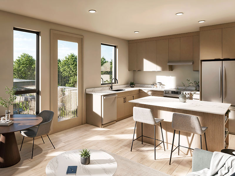 Choose from thoughtfully designed 1- and 2-bedroom homes, each featuring open layouts, natural light, and elevated finishes. From quartz countertops to Euro-style cabinetry, every detail is crafted for comfort and style. Beyond your front door, discover amenities designed for real life: electric car charging, ample parking, a pet exercise area, covered bike storage, and a landscaped courtyard with outdoor grill — all created to bring neighbors together.
